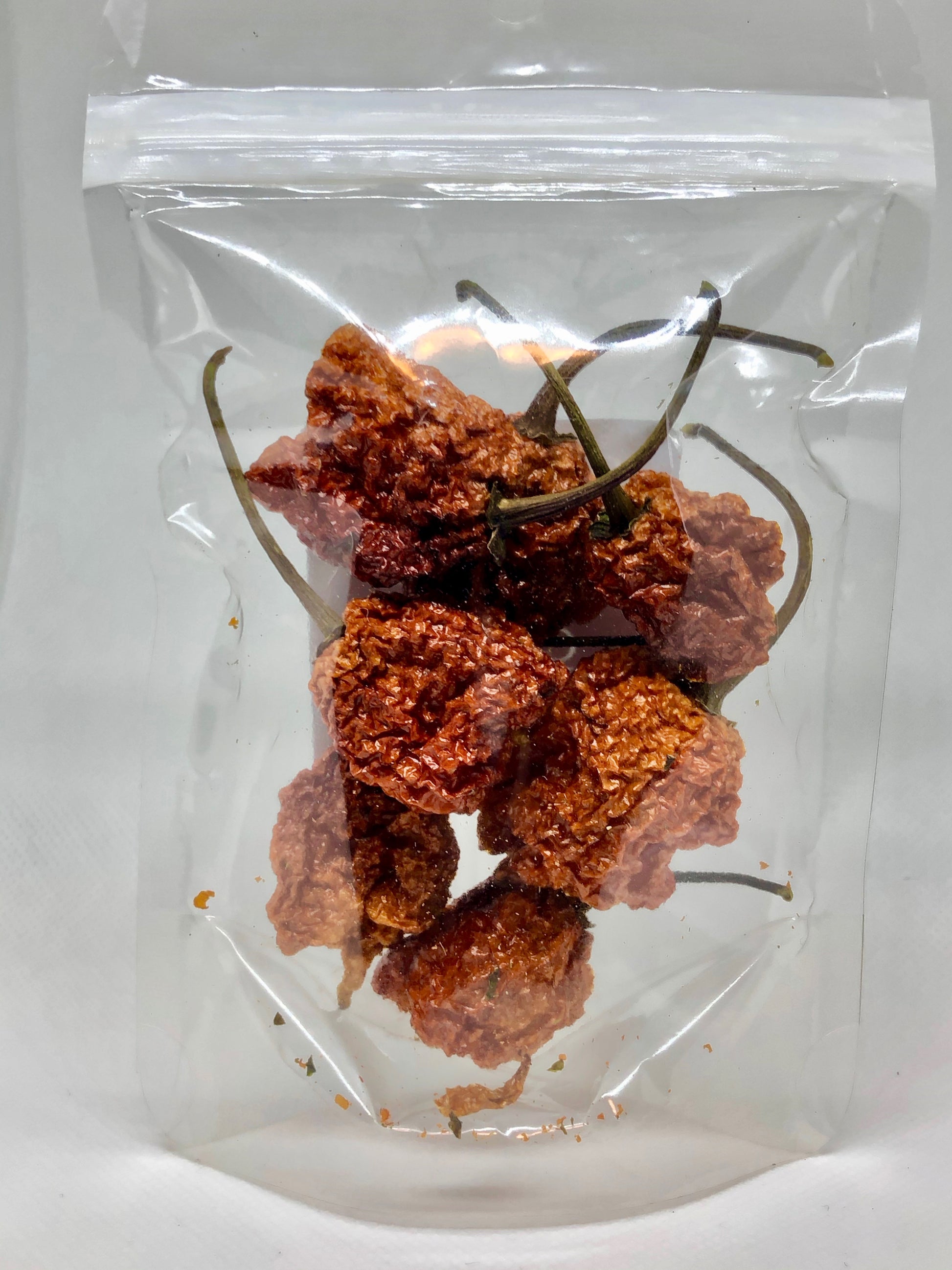 Carolina Reapers are a cross between, the Ghost Pepper and a Red Savina Habanero. A definite super hot pepper with 2,200,000 Scoville rating and still holds the ranking as the world's spiciest pepper. The Reaper has a bit more flavor than typical super hots with fruity sweet flavor coming through before the heat really kicks in. Reapers are highly desired by hot sauce makers because it has a complex flavor with a lot of spice that add depth to their sauces.