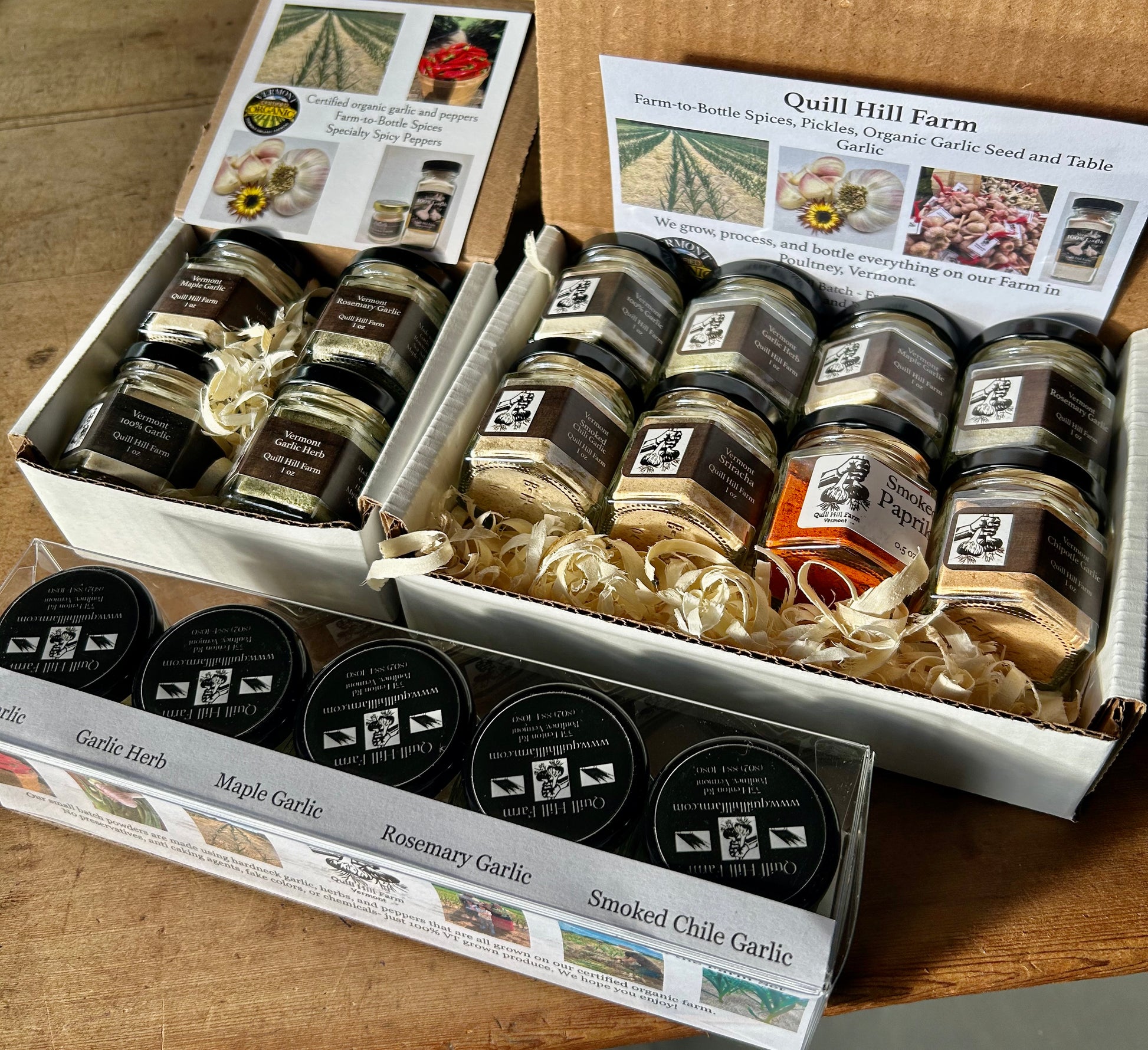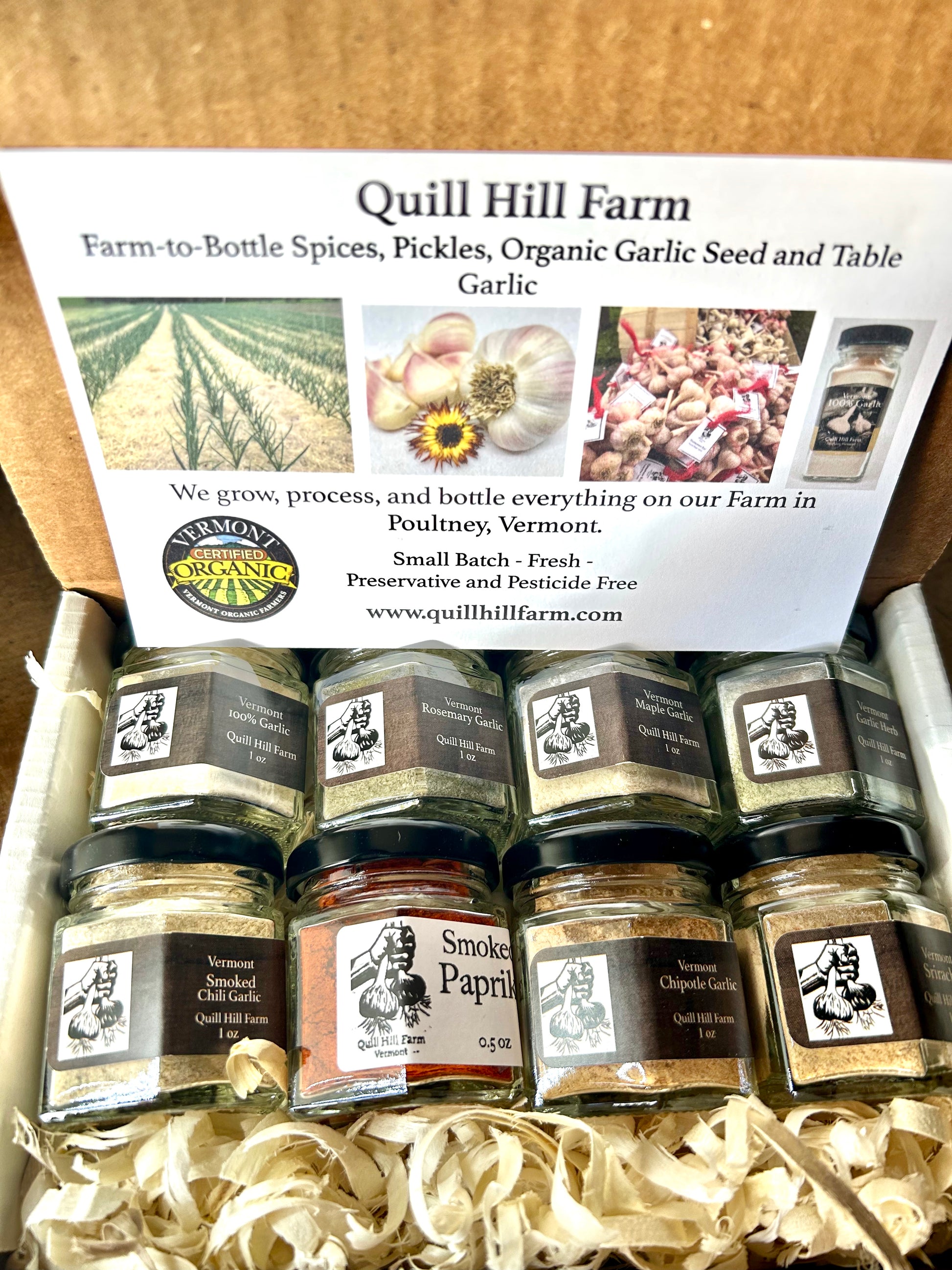 Gift box containing 8 small glass jars of our specialty farm-to-bottle spices in 1.5 oz sizes. Box includes the following flavors of 100% garlic powder, garlic herb, maple garlic, rosemary garlic, smoked paprika (new in 2025), smoked chili garlic, sriracha, and chipotle garlic. Please note that our farm has changed the shape of the small jars to the hexagon shape in 2025.